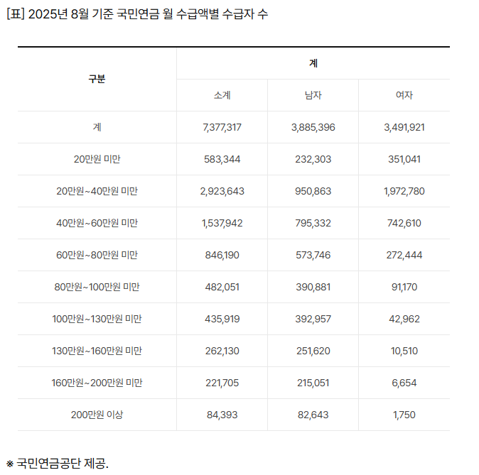 연합뉴스가 7일 국민연금공단 통계를 인용해 보도한 바에 따르면, 올해 8월 말 기준 월 100만원 이상의 국민연금 수급자는 100만4천147명으로 집계됐다. 성별로는 남성이 94만2271명, 여성이 6만1876명으로 남성이 훨씬 많았다.