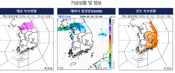 1일 밤 10시 현재 서울.인천.일부 경기도와 일부 강원내륙.산지에 대설특보가 발표된 가운데, 북쪽을 지나는 저기압의 영향으로 서해중부해상에서 눈구름대가 유입되면서 경기북부와 강원북부내륙을 중심으로 눈이 내리고 있고, 그 밖의 수도권과 강원내륙.산지, 충청권에도 눈이 날리는 곳이 있겠다. .