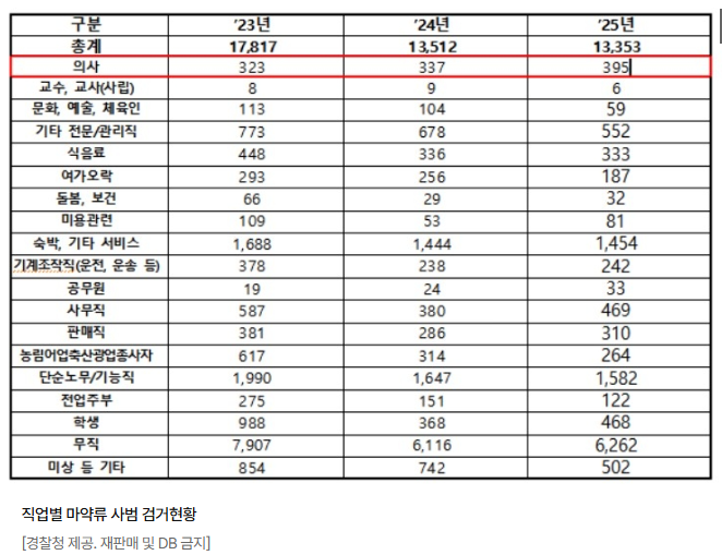 연합뉴스는 지난해 검거된 마약류 사범은 1만3353명이라고 보도했다. 직업별로는 전업주부 122명, 문화·예술·체육인 59명, 공무원 33명, 교수·교사(사립) 6명 등도 검거됐다. 무직은 6062명으로 절반 가까이 차지했다. 이외에도 ▲ 단순노무·기능직 1582명 ▲ 숙박·기타 서비스 1454명 ▲ 기타 전문·관리직 552명 ▲ 사무직 469명 ▲ 학생 468명 등이 뒤를 이었다.