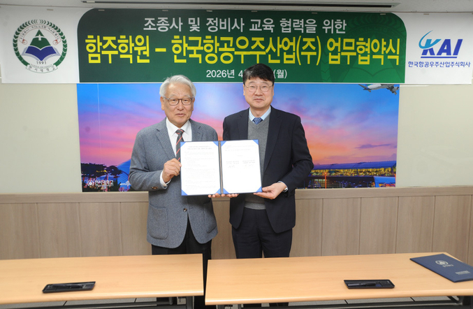 한국항공우주산업(대표 김종출, 이하 KAI)가 항공 전문 인력 양성을 위한 산학 협력에 나서며 글로벌 항공 교육 생태계 확대에 속도를 내고 있다. KAI는 13일 함주학원과 조종사 및 정비사 교육 협력을 위한 업무협력 합의서(MOA)를 체결했다고 밝혔다.