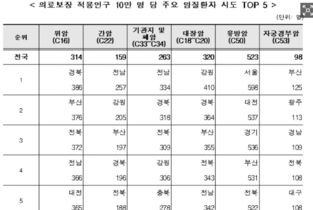 한국재난안전뉴스 이계홍 기자 | 위암 환자는 경북, 대장암은 강원, 간암·폐암은 전남, 유방암 환자는 서울에 가장 많다. 건강보험공단이 지역별 의료이용 통계연보를 발간한 결과에서 드러난 수치다. 작년 의료보장 전체 진료비는 128조원이며 인당 월평균 21만3.000원을 지급했다. 연합뉴스가 건강보험공단이 31일 발표한 지역별 의료이용 통계연보를 인용, 보도한 바에 따르면, 인구 대비 위암 환자가 가장 많은 시·도는 경북으로 나타났다. 대장암은 강원, 간암·기관지 및 폐암은 전남에, 유방암은 서울에, 대장암은 강원에 상대적으로 환자가 많았다. 국민건강보험공단이 발간한 '2024년 지역별 의료이용 통계연보'에 따르면 지난해 건강보험과 의료급여 수급권자를 합친 전체 의료보장 적용 인구 10만 명당 암 질환자 수는 유방암이 523명으로 가장 많았고, 대장암 320명, 기관지 및 폐암 263명 등의 순이었다. 간암은 10만 명당 159명, 자궁경부암은 98명이다. 환자 실거주지를 기준으로 17개 시도별로 보면 위암의 경우 경북의 인구 10만 명당 환자 수가 386명으로 가장 많았고 부산(376명), 전북(372명) 순으로 뒤를 이었다. 간암은 전남(257명), 강원(