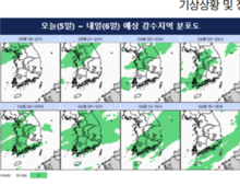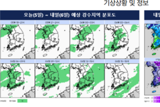 한국재난안전뉴스 이계홍 기자 | 5일 밤부터 월요일인 6일 내일 낮까지 전국 대부분 지역에 비가 내리겠다. 6일 오후부터 북서쪽에서 찬 공기가 내려오면서, 7일 아침 기온이 일보다 5~10℃가량 낮겠다. 불안정한 날씨에 감기 조심해야 할 것 같다. 다음은 기상청이 발표한 6일과 7일 기상 예보. < 강수 및 유의 사항 > ○ 5일 밤(18~24시)부터 중부지방에 비가 시작되어, 6일 새벽(00~06시)에 전라권과 경북중.북부로, 6일 오전(06~12시)에 전국으로 비가 확대되겠으나, 수도권은 6일 오전(09~12시)에, 그 밖의 지역은 오후(12~18시)에 대부분 그치겠다. * 예상 강수량(5~6일) - (수도권) 서울.인천.경기: 5~20mm/ 서해5도: 5~10mm - (강원도) 강원내륙.산지: 5~20mm/ 강원동해안: 5mm 미만 - (충청권) 대전.세종.충남, 충북: 5~20mm - (전라권, 6일) 광주.전남, 전북: 5~20mm - (경상권, 6일) 부산.울산.경남, 대구.경북: 5~20mm/ 울릉도.독도: 5~10mm - (제주도, 6일) 제주도: 5mm 안팎 또한, 5일밤과 6일 비가 내리는 지역에는 돌풍과 함께 천둥.번개가 치는