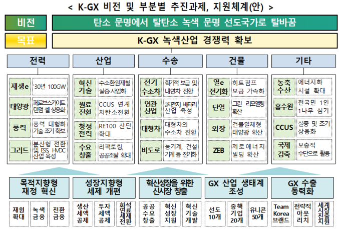 아울러, 정부는 2035 NDC 수립의 후속 조치로 태양광, 풍력, 전력망, ESS, 전기차, 배터리, 히트펌프 등 녹색산업 육성을 위한 세부 추진과제를 담은 K-GX(Green Transformation, 녹색전환)을 관계부처, 산업계 등과 함께 내년 상반기까지 수립할 것이라고 밝혔다.
