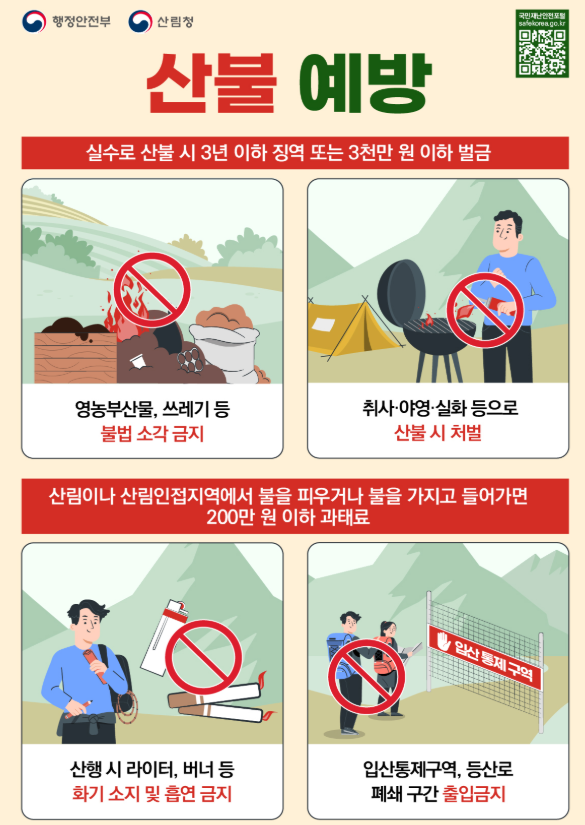 날씨가 좋아도 도로 살얼음이 발생하기 쉬운 다리 위나 고가도로, 터널, 지하차도, 급커브, 그늘진 구간에서는 속도를 줄여 안전하게 지나간다. 한편, 최근 건조한 날씨가 지속되면서 산불 발생 위험이 커져 성묘 등으로 산을 찾을 경우 산불 예방에 각별한 주의가 필요하다. 최근 10년간(2015~2024) 2월에 발생한 산불은 총 741건으로, 2,662ha의 산림이 소실됐다. 최근 10년(‘15~’24)간 산불 발생 현황: 총 5,455건, 산림 피해면적 40,032ha