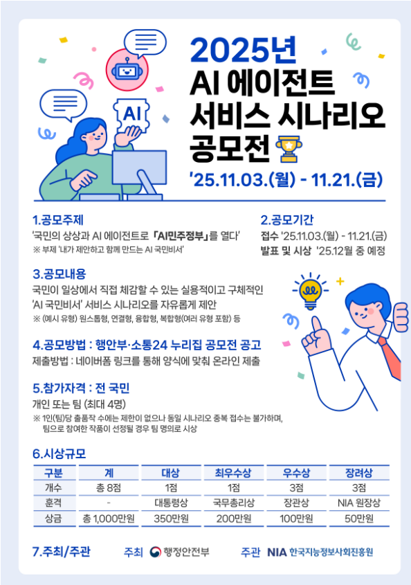 행정안전부(장관 윤호중)는 국민이 일상에서 체감할 수 있는 ‘AI 국민비서’ 서비스 시나리오를 발굴하기 위해 3일부터 21일까지 ‘2025년 AI 에이전트 서비스 시나리오 공모전’을 개최한다고 밝혔다. 이번 공모전은 ‘국민의 상상과 AI 에이전트로 「AI민주정부」를 열다’를 주제로, 국민이 일상에서 체감할 수 있는 실용적이고 구체적인 ‘(가칭)AI 국민비서 서비스 시나리오’를 제안받기 위해 마련됐다.