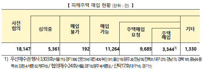 10월 28일 기준으로 피해자로부터 총 1만 8147건의 피해주택 매입 사전협의 요청이 들어왔으며, 이 중 11,264건은 현장조사 등 매입 심의가 완료되어 피해자에게 매입이 가능함을 알렸다. 현재까지 협의・경매 등을 통해 매입한 피해주택은 총 3344호로, 「건축법」 위반건축물도 993호 매입하는 등 전세사기피해자의 주거안정을 지원하기 위해 적극 노력하고 있다.