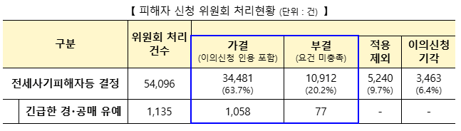 이날 가결된 503건 중 458건은 신규 신청(재신청 포함) 건이고, 45건은 기존 결정에 이의신청을 제기하여 「전세사기피해자법」 제3조에 따른 전세사기피해자의 요건 충족 여부가 추가로 확인되면서 전세사기피해자 및 피해자 등으로 결정됐다.