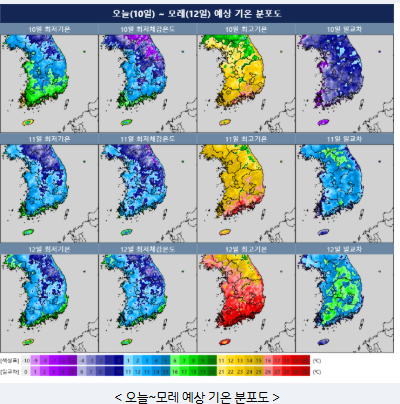 한편, 10일 경기동부와 강원내륙.산지, 남부 높은 산지를 중심으로, 11일과 12일은 전국 내륙중심으로 서리가 내리는 곳이 있겠고, 얼음이 어는 곳도 있겠으니, 농작물 관리에 유의하기 바라며, 내일과 모레는 전국 내륙을 중심으로 낮과 밤의 기온차가 15℃ 안팎으로 크겠으니, 급격한 기온 변화로 인한 건강관리에 유의하기 바란다.