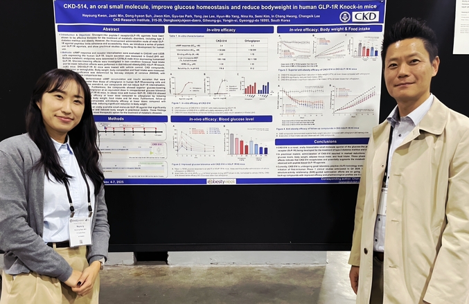 4일 미국 애틀란타에서 열린 ‘2025 미국비만학회(2025 Obesity Week)’에서는 경구용 GLP-1 수용체 작용제(GLP-1RA) 신약 후보물질 ‘CKD-514’의 비임상 연구 성과를 발표했다. CKD-514는 용해도 개선을 통한 구조적 이점을 바탕으로 대동물 모델에서 우수한 경구 생체이용률(Dog BA)을 보였으며, 경구용 비만치료제 오포글리프론(Orforglipron) 대비 적은 용량에서 유의한 체중 감소 효과와 동일 용량 대비 우수한 혈당 강하 효과를 나타냈다.