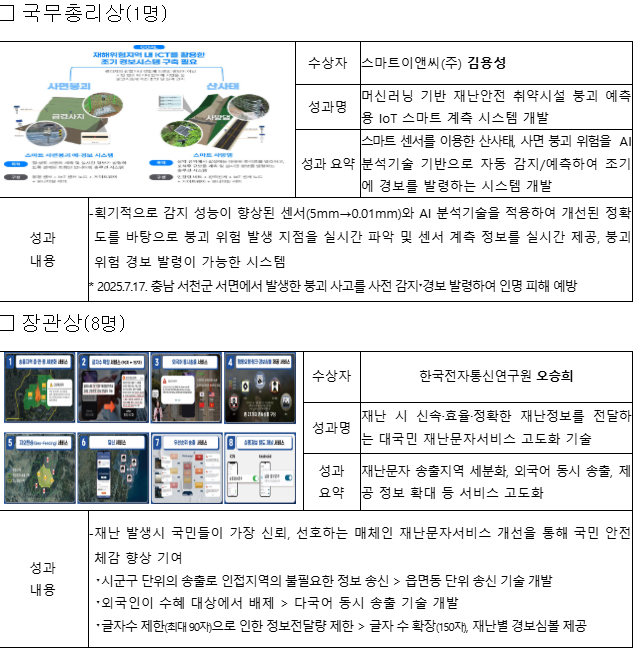행정안전부장관상(부상 각 100만 원)은 인파사고, 풍수해, 화재, 지질 등 다양한 재난 분야에서 총 8개의 연구과제가 선정됐다. ‘대국민 재난문자서비스 고도화 기술(한국전자통신연구원, 오승희)’은 송출 단위 세분화(시·군·구→읍·면·동), 다국어 동시 송출, 글자 수 확장 등 재난문자 서비스의 품질 향상과 편의성 개선에 기여하고 있다.