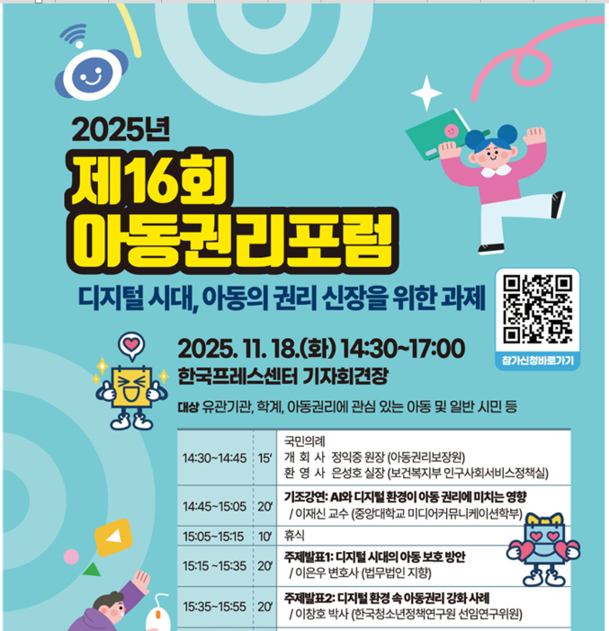 보건복지부(장관 정은경)와 아동권리보장원(원장 정익중)은 18일 오후 서울 중구 한국프레스센터 기자회견장에서 2025년 제16회 아동권리포럼을 가졌다. 포럼의 주제는 「디지털 시대, 아동의 권리 신장을 위한 과제」로, 보건복지부와 아동권리보장원은 인공지능(AI) 기술 활용이 급증한 디지털 시대에 아동의 권리를 보호하고 증진할 방안을 모색하기 위해 마련했다.