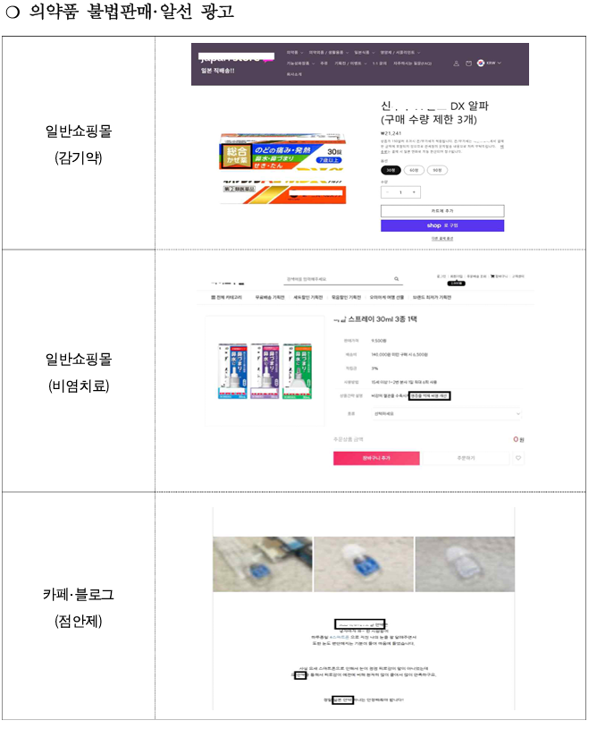 (불법판매광고) 온라인을 통해 감기약, 비염약, 점안액 등 판매를 알선한 광고 의약외품 부당광고 점검 결과겨울철 많이 사용하는 마스크, 외용소독제, 콘택트렌즈관리용품의 온라인광고를 점검한 결과, ▲의약외품 거짓·과장 광고 83건(72.8%) ▲의약외품 불법 해외 구매대행 광고 19건(16.7%) ▲의약외품 오인 광고 12건(10.5%)등 불법유통·부당광고 게시물 114건을 적발.