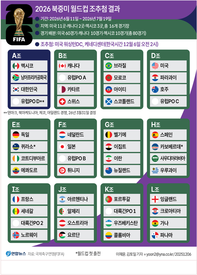 경기 시간 등 세부 일정은 하루 뒤인 7일 오전 2시에 발표된다.23번째 월드컵인 2026년 대회는 내년 6월 11일부터 7월 19일까지 미국과 캐나다, 멕시코의 16개 경기장에서 펼쳐진다.