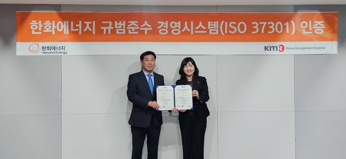 [한국재난안전뉴스 이용훈 기자] 한화에너지(대표 이재규)는 지난 12월 1일 글로벌 인증기관인 한국경영인증원(KMR)으로부터규범준수 경영시스템(ISO 37301) 인증을 획득했다고 8일 밝혔다.