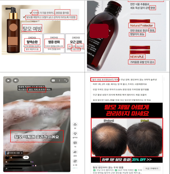 화장품에 대해 탈모·무좀 치료 등 의학적 효능·효과를 표방하는 화장품 온라인 부당광고를 점검한 결과 ▲탈모약, 무좀치료 등 의약품으로 잘못 인식할 우려가 있는 광고(77건, 100%)가 적발됐다.