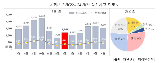 최근 3년간(’22~’24년) 등산사고는 총 2만 8624건, 인명피해는 8780명이 발생했다. 겨울철에는 추운 날씨 등으로 산행 인구가 줄어들면서 사고 발생도 감소하는 경향을 보였으나 산행객 대비 사고율은 높다.