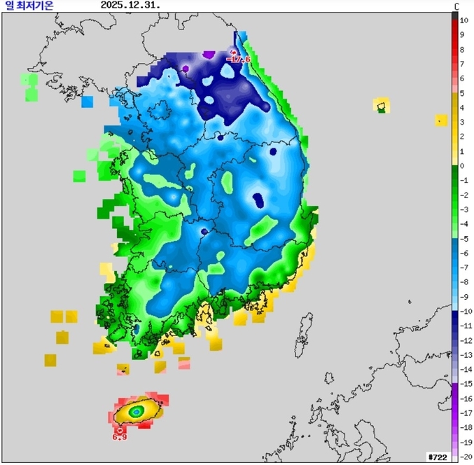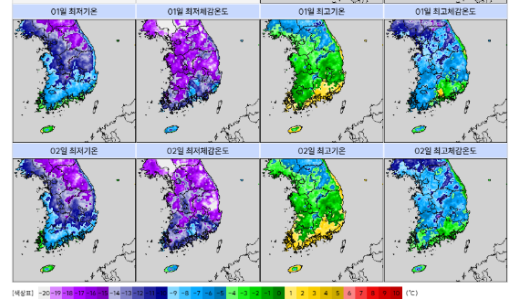 1월 1일 아침 최저기온은 -16∼-4도, 낮 최고기온은 -6∼3도로 예상되며 2일은 -17∼-5도와 -6∼4도겠다. 31일 관측지점 해발고도가 1263m인 강원 고성군 향로봉은 아침 기온이 -17.6도까지 내려갔다. 체감온도는 -30.1도까지 떨어졌다. 관측지점 해발고도 1050m 화천군 광덕산도 아침 최저기온이 향로봉과 같이 -17.6도였다. 광덕산 최저 체감온도는 -28.1도였다.