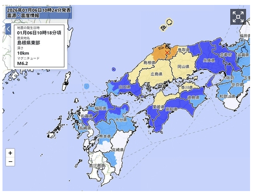 일본 기상청은 애초 지진 규모를 6.2로 발표했다가 6.4로 수정했으며 진원 깊이도 애초 10㎞에서 11㎞로 변경했다. 이 지진으로 시마네현 동부와 돗토리현 서부 일부 지역에서는 진도 5강의 흔들림이 감지됐다.