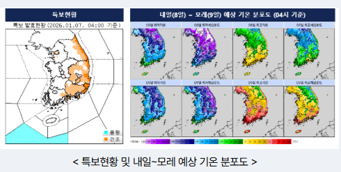 - 7일 오후부터 북서쪽에서 찬 공기가 내려오면서 8일과 모레 전국 대부분 지역의 아침 기온이 7일보다 5℃ 이상(강원내륙.산지 10℃ 이상) 낮아 -5℃ 이하(경기북부.동부와 강원내륙.산지, 충북, 경북북부내륙 -10℃ 이하)로 춥겠다.