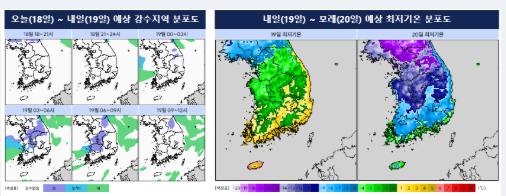 18일 밤(18~24시)부터 강원북부동해안.북부산지에 비 또는 눈이 내리겠고, 19일 새벽(00~06시)부터 오전(06~12시) 사이 중부지방(서울.인천.경기북서부, 강원중.남부동해안 제외)과 전북, 경북남서내륙.북부내륙.북동산지, 경남서부내륙에 비 또는 눈이 내리는 곳이 있겠다.