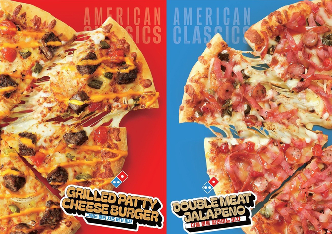 도미노피자의 ‘그릴드 패티 치즈 버거 피자’는 아메리칸 클래식 치즈 버거 소스와 그릴드 패티를 사용해 달콤짭짤한 맛과 직화향의 육즙이 조화를 이뤄 미국 치즈 버거의 맛을 느낄 수 있도록 했다. 또한 더블 미트 할라피뇨 피자는 슈레드 햄과 이탈리안 페퍼 소시지를 통해 풍성한 미트의 맛을, 할라피뇨를 토핑으로 사용해 깔끔한 매운맛을 선보이는 피자다.