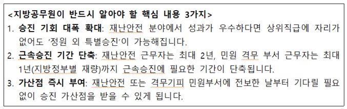 2. 근속승진 기간 단축: 재난안전 근무자는 최대 2년, 민원 격무 부서 근무자는 최대 1년(지방정부별 재량)까지 근속승진에 필요한 기간이 단축됩니다.
