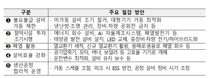 또한 운전변수를 최적화하고, 피크시간 가동 조절 및 에너지저장장치(ESS) 활용으로 전력계통에 대한 부담도 줄인다. 기후에너지환경부는 주기적인 점검을 통해 이행을 지원하고, 목표달성 시, 에너지 절약시설 설치 융자 우선지원 등의 혜택을 부여할 예정이다.